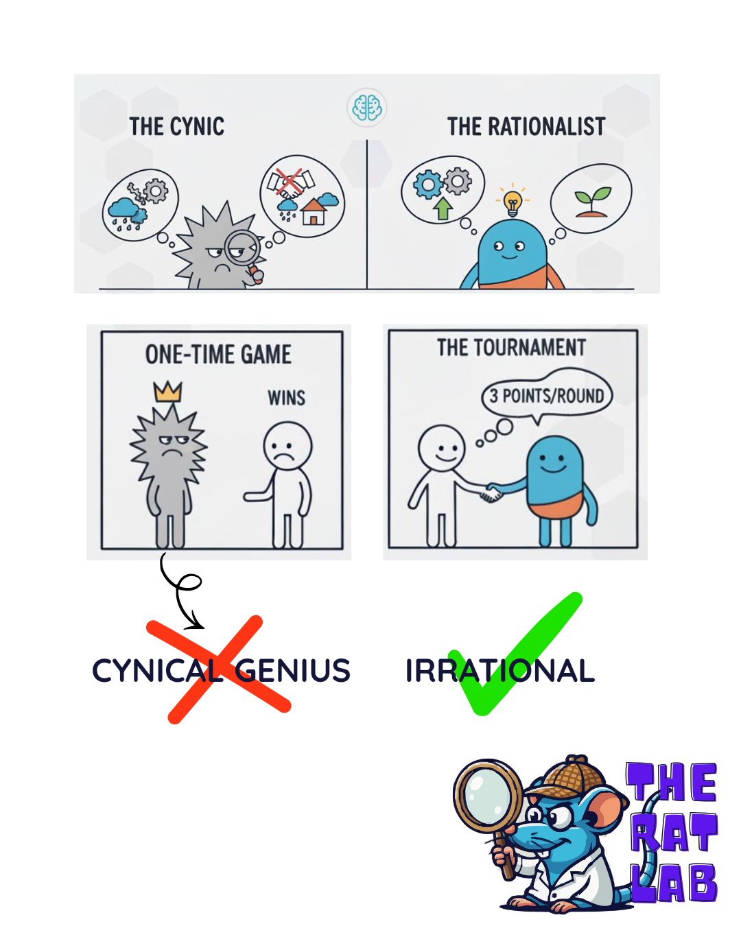 To test this, Axelrod didn’t turn to philosophy, he turned to code. He organized a tournament based on the Iterated Prisoner’s Dilemma to find the mathematically perfect survival strategy. The results didn’t just change game theory, they debunked the idea that cynicism is “rational” once and for all.